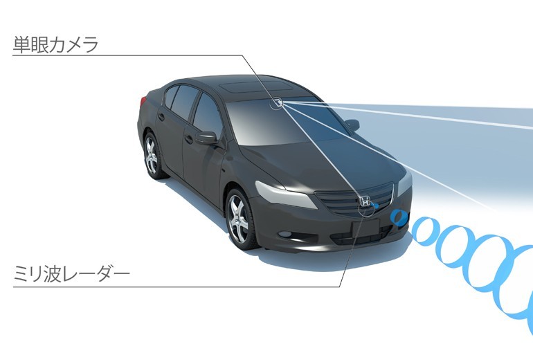 これはフロントグリル内に設置したミリ波レーダーと、フロントウインドウ内上部に設置した単眼カメラの2種類のセンサーで構成されたシステム。ミリ波レーダーは、対象物体の位置や速度を捉えるとともに、その検知対象を電波の反射率が低い歩行者まで拡大し、性能を高めている。さらに単眼カメラでは車両前方約60mまでの歩行者や対象物体の属性や大きさなどを識別、より精度の高い認識を実現するという。
