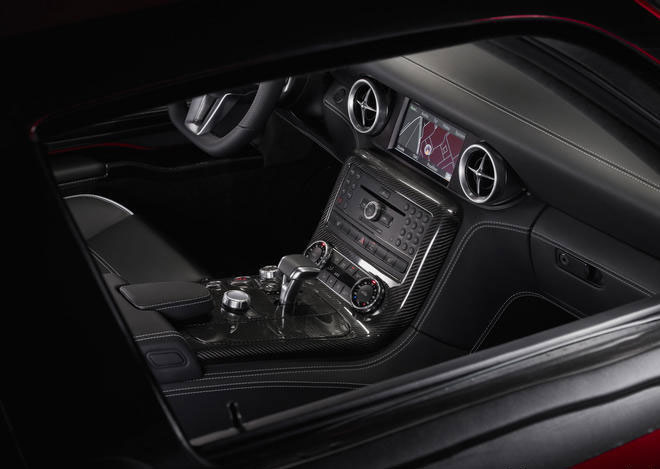 SLS はオールアルミスペースフレーム構造を採用。ボディにもアルミがふんだんに使用され、トータル重量は約1620kgに抑えられた。前後重量配分は48対 52と理想的。0-100km/h加速3.8秒、最高速315km/hという圧倒的パフォーマンスを身につけている。