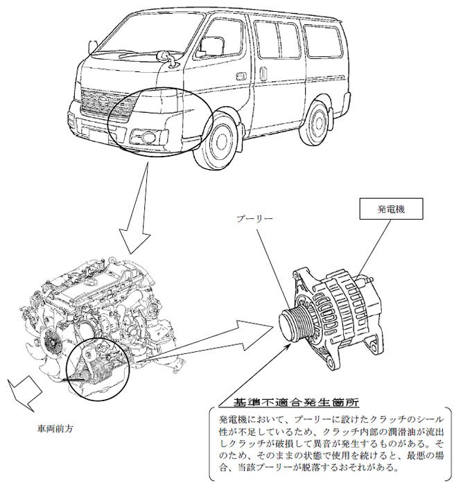 発電機に関しては、プーリーに設けたクラッチのシール性が不足。クラッチ内部の潤滑油が流出してクラッチが破損。最悪の場合、プーリーが脱落するおそれがある。
