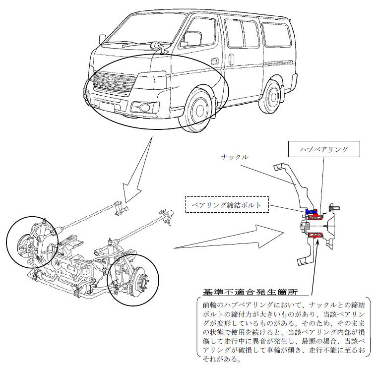 ハブベアリングについては、前輪のハブベアリングでナックルとの締結ボルトの締め付け力が大きいものがあり、ベアリングが変形。走行中に異音が発生するほか、ベアリングが破損して車輪が傾き、走行不能に陥る可能性がある。