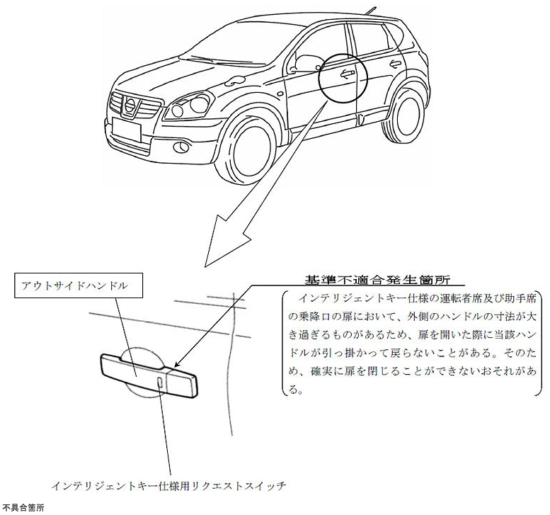 インテリジェントキー仕様のドア(運転席および助手席)において、外側のハンドルの寸法が大きすぎるものがあるため、ドアを開いた際にハンドルが引っかかって戻らない可能性がある。そのため確実にドアを閉じられないおそれがある。