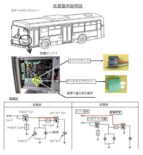(1)については全車両、フォグランプの電気回路配線を変更するとともに、テールランプリレーとリレーソケットを新品に交換する。(2)については、全車両ブラケットの溶接状態を点検し、不適切なものは溶接する。
