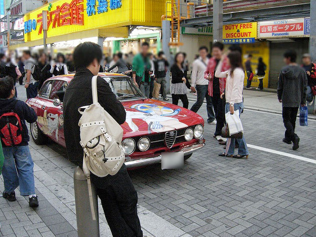 イタ車(イタリア車)として有名なアルファロメオだが、同社製の「アルファロメオ ジュリア 1750GTV」の痛車がゲーマーズ本店前に登場し、それを撮影する人々でちょっとした騒ぎになっていた。