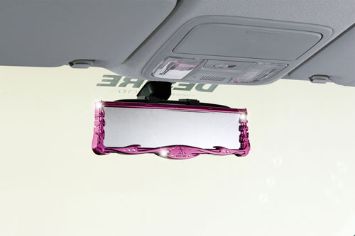 彫りの深い彫刻的なデザインのフレームにスワロフスキーを10粒あしらったゴージャスなルームミラー。フレームはクローム、アルマイトピンク、アルマイトブルーの3色をラインナップする。スワロフスキーは穴に埋め込むように貼り付けてあるので、簡単には落ちないようになっている。鏡面はやや広角となっているので、後方の視認性も高まる。