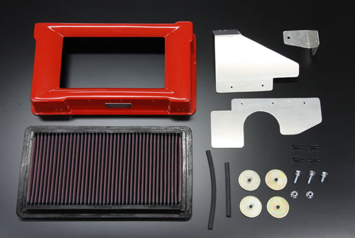 『スポーツインダクションボックス』は純正エアクリーナーエレメントを活用するタイプのインテークパーツ。吸入抵抗となる消音レゾネーターとクリーナー吸入側ケース部のみを開放して、フレッシュエアをダイレクトにスロットルに導くことで、吸入効率を向上させるのが特徴だ。キットはアルミ製遮熱板と整流効果を高めるファンネルタイプのFRP製フレームなどで構成されており、クリーナーカバーやエアフローセンサー周辺パーツは純正パーツをそのまま使う。