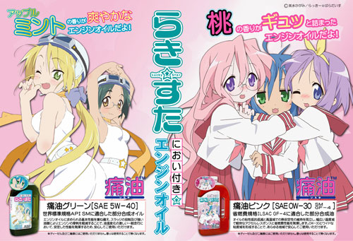この『痛油シリーズ PART-1 らきすた』は、エンジンオイルに着色し、さらに香りをつけて、透明の容器にて販売される。第一弾として用意するのは、桃の香りがする『痛油ピンク』とアップルミントの香りのする『痛油グリーン』の2種類だ。特典として非売品ステッカーがついてくる(各2000本予定)。