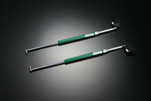 『ボンネットダンパー』は本体重量が1本あたりわずか200gという軽量ダンパーで、ボンネット全開時の角度を調整するエクステンションをアルミニウム素材とすることで、さらなる軽量化を図っている。車両側を加工取り付け可能だ。