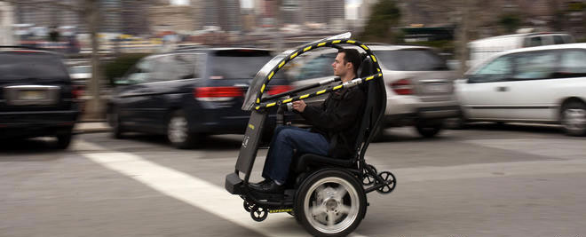 発表されたこの車両、立ち乗りで1人乗りだった「セグウェイ」を、2人が座って移動できるものとした。前後にキャスターがついているが、セグウェイ同様、走行中は2輪でバランスをとっている。