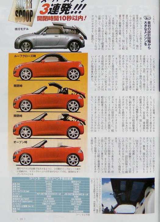 管理人もコペンに乗っていたことがあるので、次期モデルは非常に気になります。今のコペンも大好きですが、そろそろフルモデルチェンジしても良い頃です。