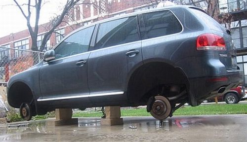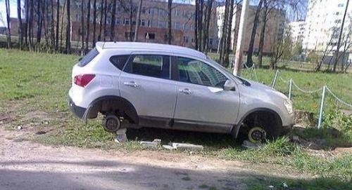 タイヤとホイールを外されて放置されている車です。
