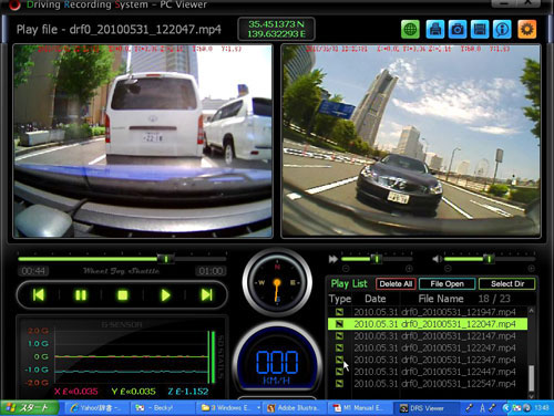 この新型ドライブレコーダーはSDカード(32GB)で最大40時間、映像と音声を記録できるのが特徴。GPSと3DGセンサーも搭載しているので、映像日時や場所、運転の状況を正確に記録する。また、SDカードにはビューアーソフトが内蔵されているので、コンピュータにインストールする必要もなく、さらにフロント/リアなどの2画面を同時に再生可能だ。