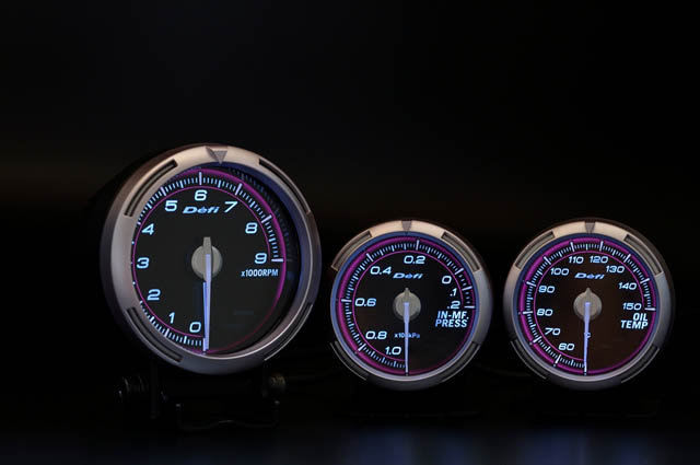 しかも、イグニッションOFFでは盤に細かく刻まれた目盛りと数字が消滅してシンプルなデザインとなり、イグニッションONで細かな目盛りと数字が浮き上がるという、凝ったデザインを採用。そしてイルミネーションONでは追加メーター初となる2色使い発光により、メーター周囲部分も美しく発光(ブルーかピンク)するので、多彩な表情が楽しめる。Defiとしては初の白い指針も、大人っぽさを演出してくれる。