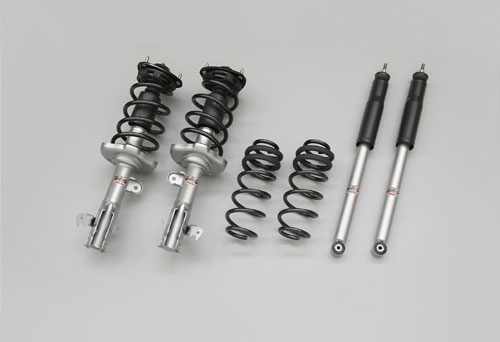 まず『タイプ フレックス』はストリートからワインディング走行をターゲットに開発された全長調整式のショックアブソーバーキットだ。『スーパー ストリート』はストリート走行向けにセッティングされたビギナー用の車高調で、突き上げ感を抑えた、快適な乗り心地を確保するという。両方とも、伸縮同時の減衰力16段調整機能付き。『ハイテク』は乗り心地、異音、へたりに対する3大保証付きのローダウンスプリングで、素材にはバナジウムを配合した SAE9254材を採用して軽量化と高品質を実現している。