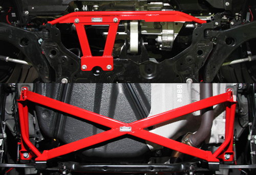 ともにボディ強化用パーツだが、『タワーブレースセット』はボディ上部のサスタワー周辺からボディパネル部までの広範囲を、そして『メンバーブレースセット』は車体フロア全体の剛性を向上させる。両製品ともに高剛性スチール製オーバルシャフトや応力分散構造の採用、また車種に併せて最適な構成・設計をすることで、高レベルの剛性を確保したという。高剛性の実現により、サスペンションのジオメトリー変化を抑制し、ステアリングレスポンスの向上や乗り心地の改善にも貢献する。