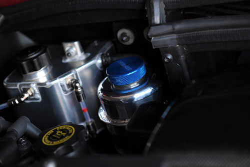 『レーシングPSタンク』はエンジンの高回転域におけるフルードの気泡をスワール効果(渦巻き)により抑制する特殊二重構造のパワステ用アルミタンク。純正と交換するだけで高温・高回転・高負荷という激しい状況下においても、リニアで安定したステアリングフィールを実現するという。