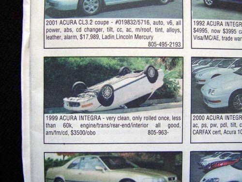 インテグラがひっくり返っていますねw。この広告を出した会社ではけっして事故車を扱ってはいませんw