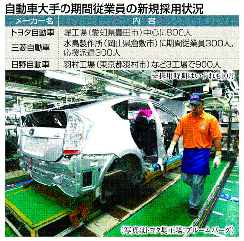 トヨタ自動車は8日、10月から愛知県内の車両組立工場などで、期間従業員約800人の採用を再開すると発表した。ハイブリッド車(HV)などエコカーの受注好調を受けて生産が回復しているためで、期間従業員の採用は昨年6月以来、1年4カ月ぶりとなる。自動車大手では三菱自動車、日野自動車の2社も期間従業員の採用を再開している。8月の登録車販売が13カ月ぶりに前年超えとなるなど自動車市場は回復傾向にあるが、生産現場にも徐々に活況が戻ってきた。