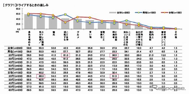 ドライブの楽しみを聞いてみると、1位は「景色」(58.8%)、2位「気分転換/ストレス発散」(55.3%)、3位「観光」(50.6%)の順となった。これを20代でみると、男性は「運転自体」(61.0%)、女性は「気分転換/ストレス発散」(66.0%)がトップになっている。