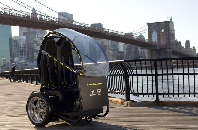 発表されたこの車両、立ち乗りで1人乗りだった「セグウェイ」を、2人が座って移動できるものとした。前後にキャスターがついているが、セグウェイ同様、走行中は2輪でバランスをとっている。