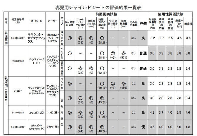 昨年度は、乳児専用1機種、乳児・幼児兼用4機種を試験した結果、乳児用としての評価で、コンビ製の『コッコロ UX』とタカタ製の『takata04-symphony EC』の2機種が、前面衝突試験結果と使用性評価試験結果の両方で高い評価を得た。