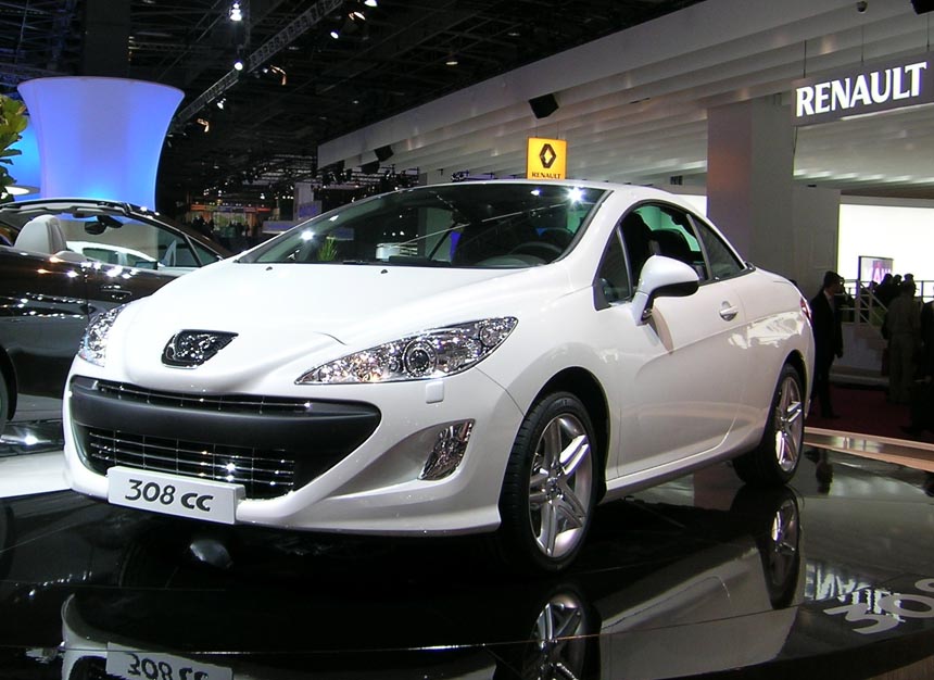 フランスPeugeot社はパリモーターショー2008で、4人乗りオープンカー「308CC」を公開した。307CCの後継で、電動ルーフは20 秒で開閉する。車両寸法は全長4400×全幅1817×全高1426mmで、ホイールベースは2605mm。307CCと比べ、全長は40mm、全幅は 58mm伸ばした。