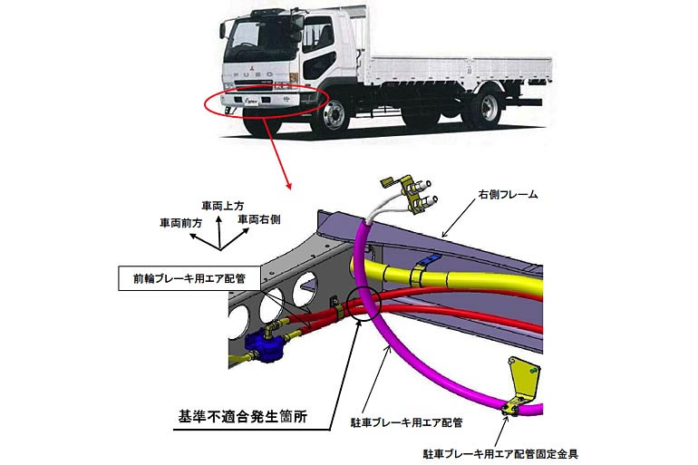 三菱ふそうは、中型トラック・ファイターの制動装置(ブレーキエア配管)に不具合が発生しリコールを発表した。