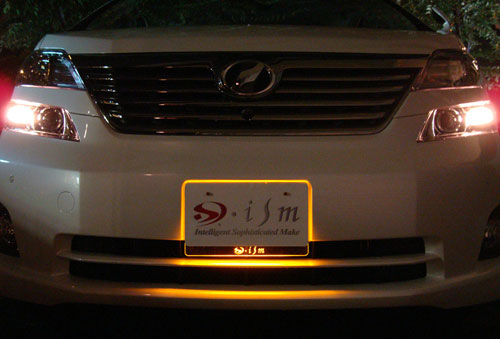 これは、ナンバープレートの周囲を均一なLEDの光で照らし出すドレスアップ商品。ライセンスランプが装着されていないクルマでも、フロントナンバーのまわりをLEDの光でライトアップすることができる。