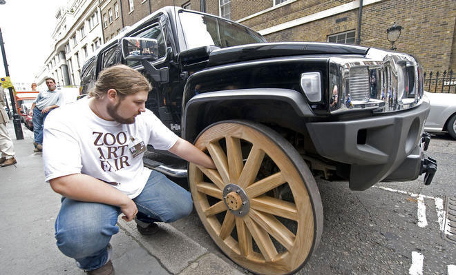 英国ロンドン在住のアーティスト、マシューハリソン氏は10月17日、ハマー『H3』をベースにした芸術作品を発表した。それは木製車輪を履いたH3。突如、ストリートに出現したH3は、ロンドンっ子のド肝を抜いた。