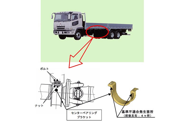 今回のリコールは、平成6年11月18日から平成20年4月25日までに製造された計6万8141台が対象となり、プロペラシャフトセンターベアリングブラケットの強度が不足しているため、高速走行により、当該ブラケット部に亀裂が発生するものがある。そのため、そのままの状態で使用を続けると亀裂の進行により当該ブラケットが破断して、プロペラシャフトが垂れ下がり、走行不能となるおそれがあるというもの。