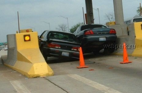 高速道路の料金所ではないですけど、急に車線が少なくなった場所で二台同時に自動車が突っ込んだ事故です。