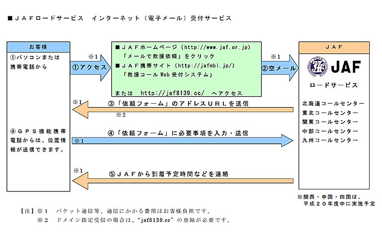 JAF(日本自動車連盟)は、インターネット(電子メール)を通じて、パソコンや携帯電話からロードサービスを依頼できるサービスを一部地域(北海道、東北、関東、中部、九州)で開始した。関西、中国、四国は平成20年度中に実施する予定。