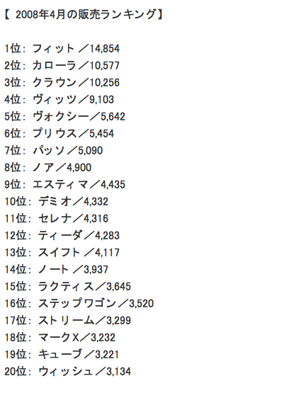日本自動車販売協会連合会は、2008年4月の乗用車車名別販売ランキングを発表した。