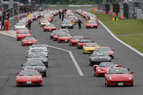 フェラーリ日本総代理店のコーンズ・カンパニー・リミテッドが主催。これまでのギネス記録はイギリスのシルバーストーンで樹立された385台だったが、 この日は新旧あわせて490台のフェラーリが登場。赤や黄色など様々なボディカラーのフェラーリがサーキットのコースを埋め尽くし、パレードを完走した。
