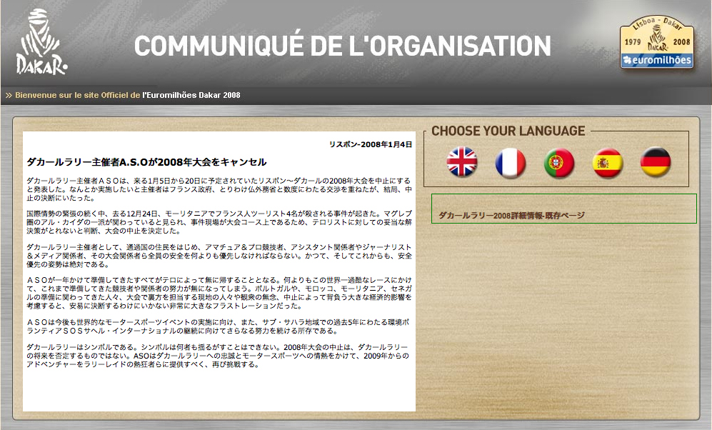 2008年のパリダカールラリーが中止になりました。