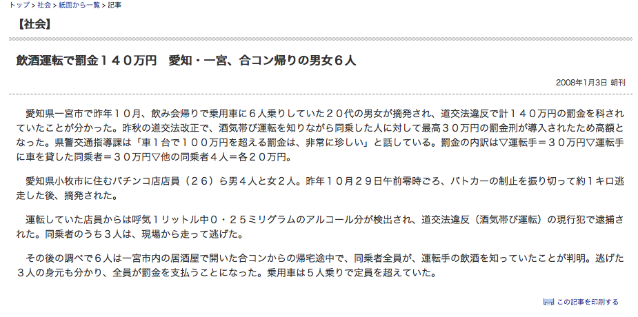 愛知県一宮市で昨年10月、飲み会帰りで乗用車に6人乗りしていた20代の男女が摘発され、道交法違反で計140万円の罰金を科されていたことが分かっ た。昨秋の道交法改正で、酒気帯び運転を知りながら同乗した人に対して最高30万円の罰金刑が導入されたため高額となった。県警交通指導課は「車1台で 100万円を超える罰金は、非常に珍しい」と話している。罰金の内訳は▽運転手=30万円▽運転手に車を貸した同乗者=30万円▽他の同乗者4人=各20 万円。