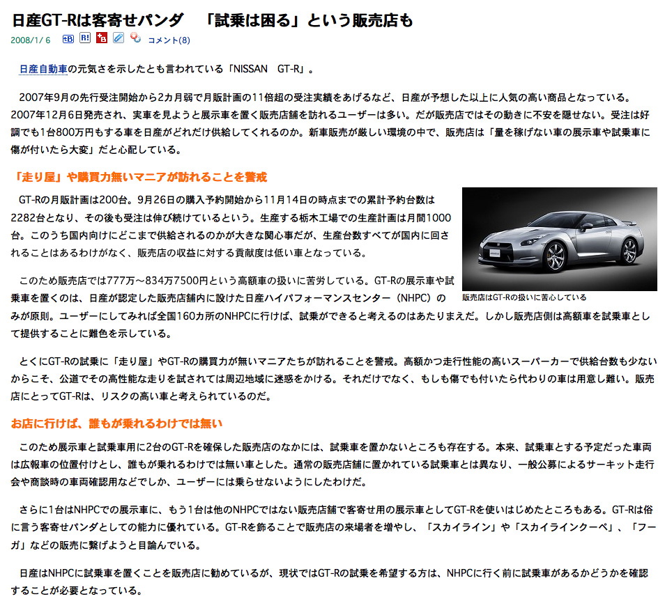 GT-Rの月販計画は200台。9月26日の購入予約開始から11月14日の時点までの累計予約台数は2282台 となり、その後も受注は伸び続けているという。生産する栃木工場での生産計画は月間1000台。このうち 国内向けにどこまで供給されるのかが大きな関心事だが、生産台数すべてが国内に回されることは あるわけがなく、販売店の収益に対する貢献度は低い車となっている。