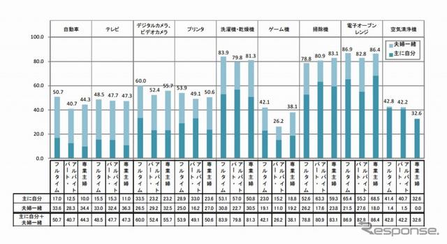 また、過去5年以内に購入した商品について、誰が中心になって商品を選んだかを聞いたところ、自動車やテレビなどの白物家電以外の製品でも40~50%はママが関わって購入していることが分かった。特にフルタイムママは「自動車」については 17.0%(パート・アルバイトママ 12.5%、専業主婦ママ 10.0%)が、「デジタルカメラ・ビデオ」については33.5%(パート・アルバイトママ 23.2%、専業主婦ママ 23.2%)が、「ゲーム機」については23.0%(パート・アルバイトママ 15.2%、専業主婦ママ 18.8%)が「主に自分が選ぶ」と回答。自動車では「夫婦で選ぶ」(33.6%)も加えると、5割以上のフルタイムママが、「自動車の購入」に関わっていることが分かった。
