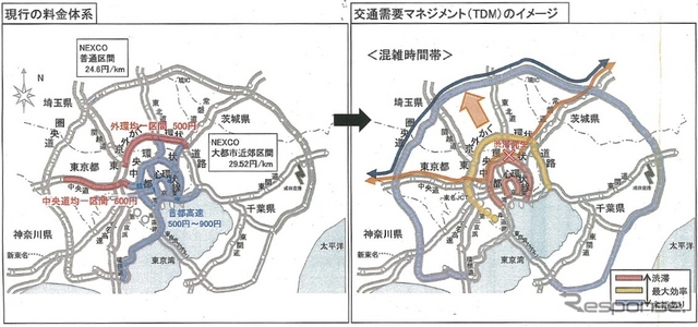 例えば、首都高速の都心環状線が渋滞している場合は、都心環状線経由の料金を割高にし、外環道や圏央道経由の料金を割安にして交通の分散を図る。
