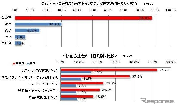 逆バレンタインに、男性にしてもらいたいことで、最も回答が多かったのは「デートでエスコートしてほしい(42%)」。「チョコレートをプレゼントしてほしい(31%)」を上回った。次にデートに連れて行ってもらう時の移動手段を質問すると、8割以上の人が「自動車(88%)」と回答。さらに、デートで男性にしてもらいたいことを聞いたところ、「車でレストランに食事をしに行く(52.7%)」が過半数を占め1位となった。