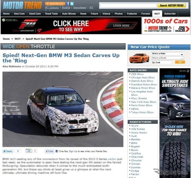 これは20日、米国の自動車メディア、『モータートレンド』が伝えたもの。同メディアが、ドイツ・ニュルブルクリンクで開発テストを行う次期M3のプロトタイプをキャッチしたのだ。