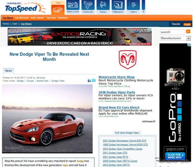 次期バイパーは2012年に発売予定。同メディアは、「新エンジンは最大出力700ps(現行型は600ps)レベル」とレポートしている。