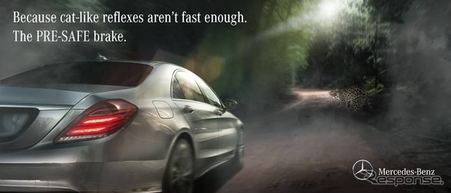 そして、メルセデスベンツは、「猫(ジャガー)のような反射神経では、速さ的に不十分。我々には危険を察知して備えるための、PRE-SAFE (プレセーフ)ブレーキがあるのです」と応じている。