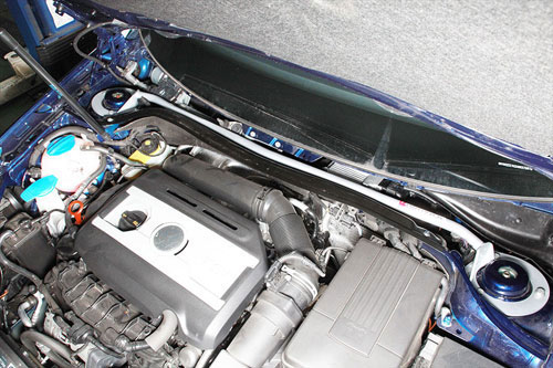 ゴルフ/シロッコのエンジンルームに合わせた形状で、日常の整備性を損なうこと無く、ボルトオン装着も可能。左右のストラットタワーを結ぶことで、コーナーリング時に発生するボディのねじれを抑制し、スタビリティの高い走りをもたらしてくれる。