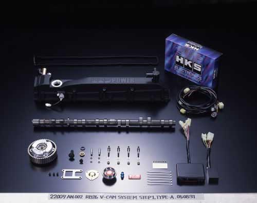 Vカムシステム・ステップ1は、RB26のインテークカムを連続可変バルブタイミング化することで中低速のトルクアップを実現し、ストリートからサーキットまで対応するHKS自信のエンジンキット。typeAはバルタイ可変量30度のノーマルエンジン対応、typeBはピストン交換を前提としたバルタイ可変量50度の設定となっている。