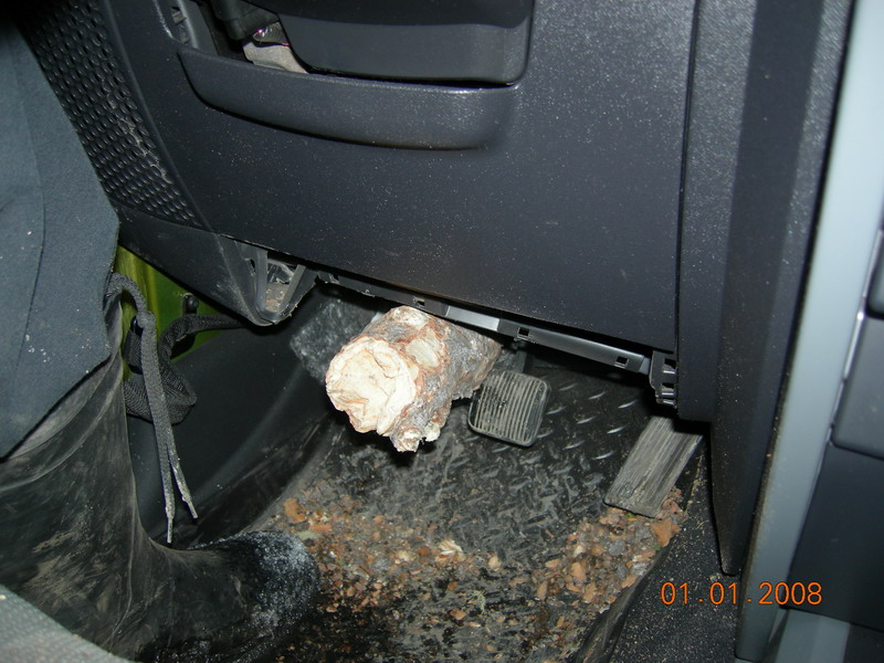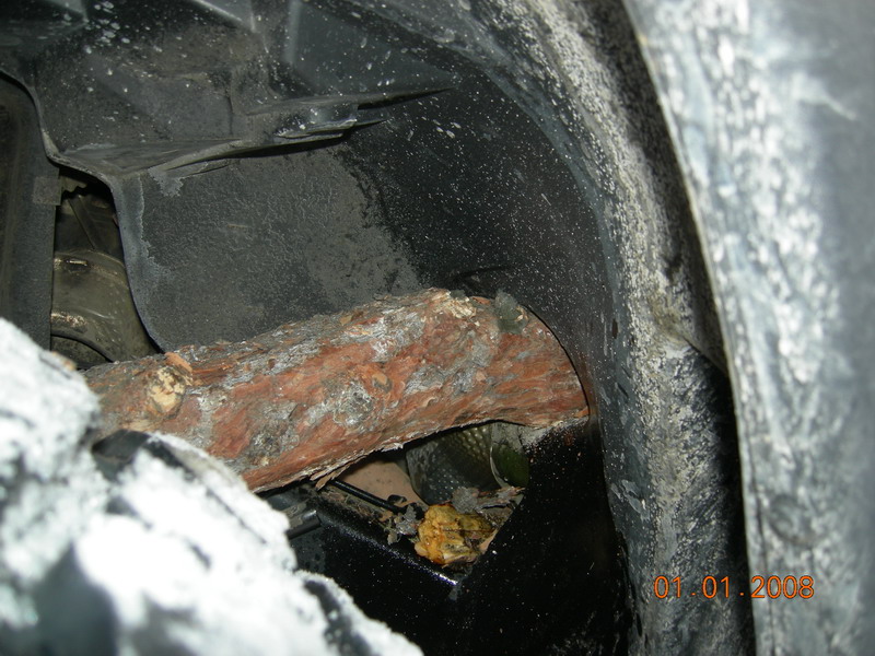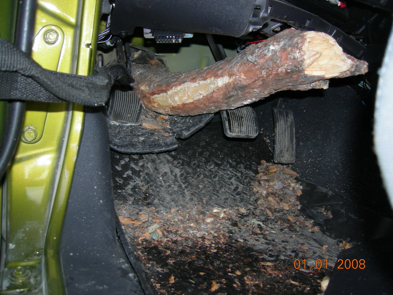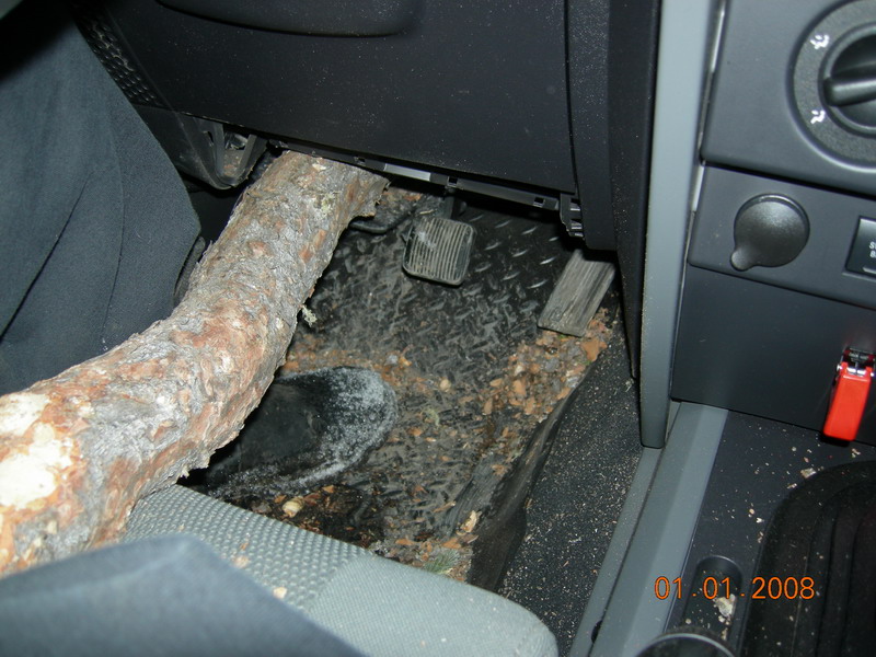 ジープラングラーに木が突き刺さっています。