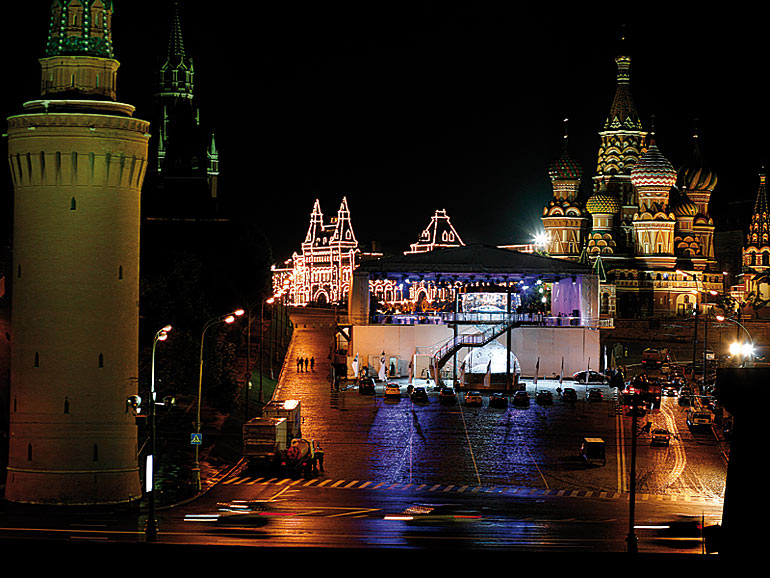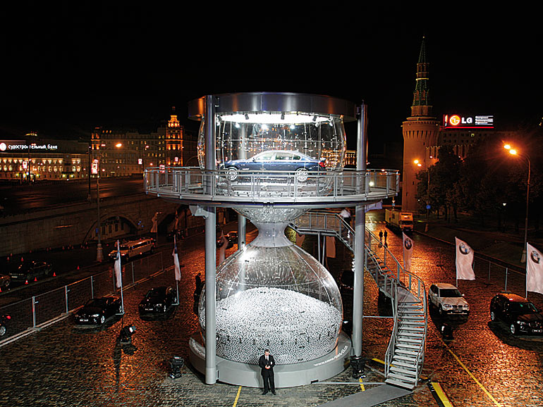 BMWは、新型7シリーズをモスクワにある赤の広場で展示した。ただの展示ではなく、高さ12mに達する巨大砂時計の中に実車を封入するという派手なものとなっている。