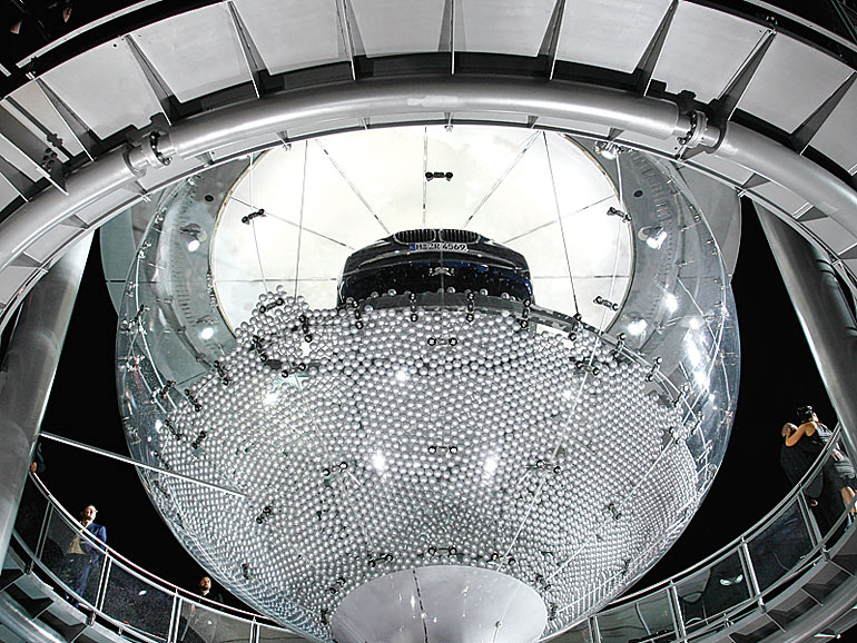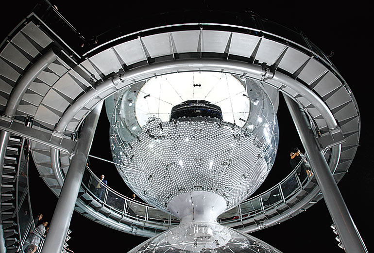 砂時計はアクリルガラス製。砂のかわりに18万個以上の銀色のボールを入れ、ボールが下に落ちるに従って7シリーズが徐々に姿を現すようにした。