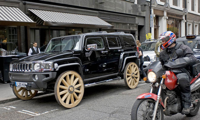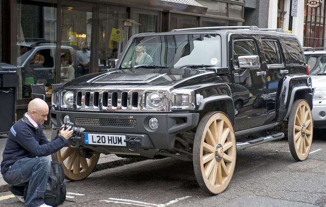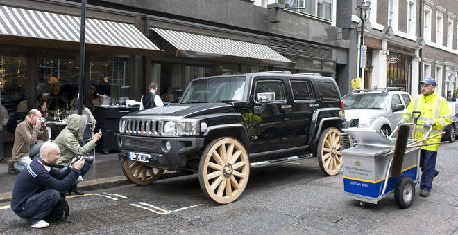 英国ロンドン在住のアーティスト、マシューハリソン氏は10月17日、ハマー『H3』をベースにした芸術作品を発表した。それは木製車輪を履いたH3。突如、ストリートに出現したH3は、ロンドンっ子のド肝を抜いた。