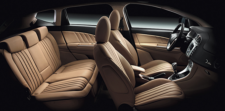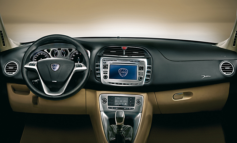 インテリアは、後部座席にスライド機構を採り入れるなどパッケージングを工夫すると同時に、素材にこだわって上質感を高めた。内装には、ランチアお得意のアルカンターラやレザーを採用。ダッシュボードは、本革のような質感を持つポリウレタン系の素材“Benova”を使用している。