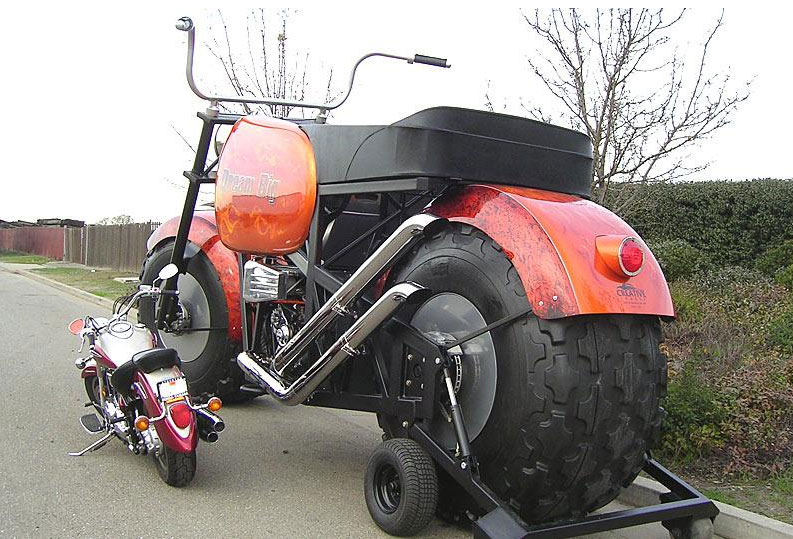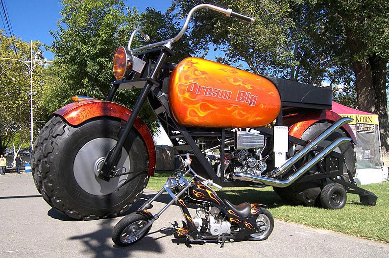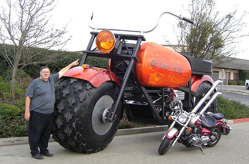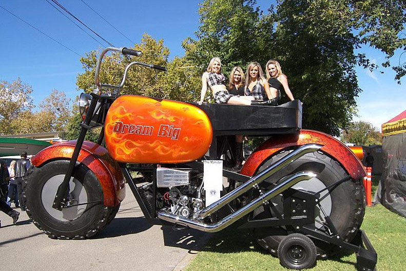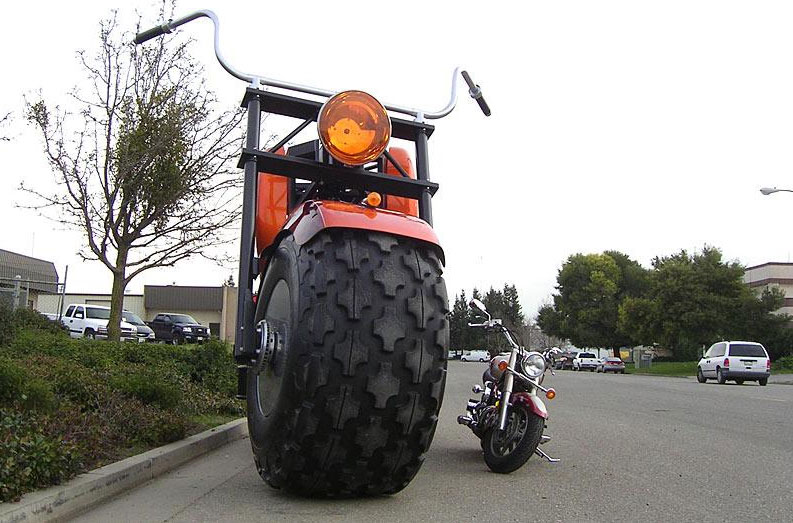 できあがったバイクは、全長20フィート4インチ(約6.2m)、全高11フィート3インチ(約3.4m)という超ビッグサイズ。タイヤも78インチ(幅36インチ)という常識はずれのサイズとなっている。